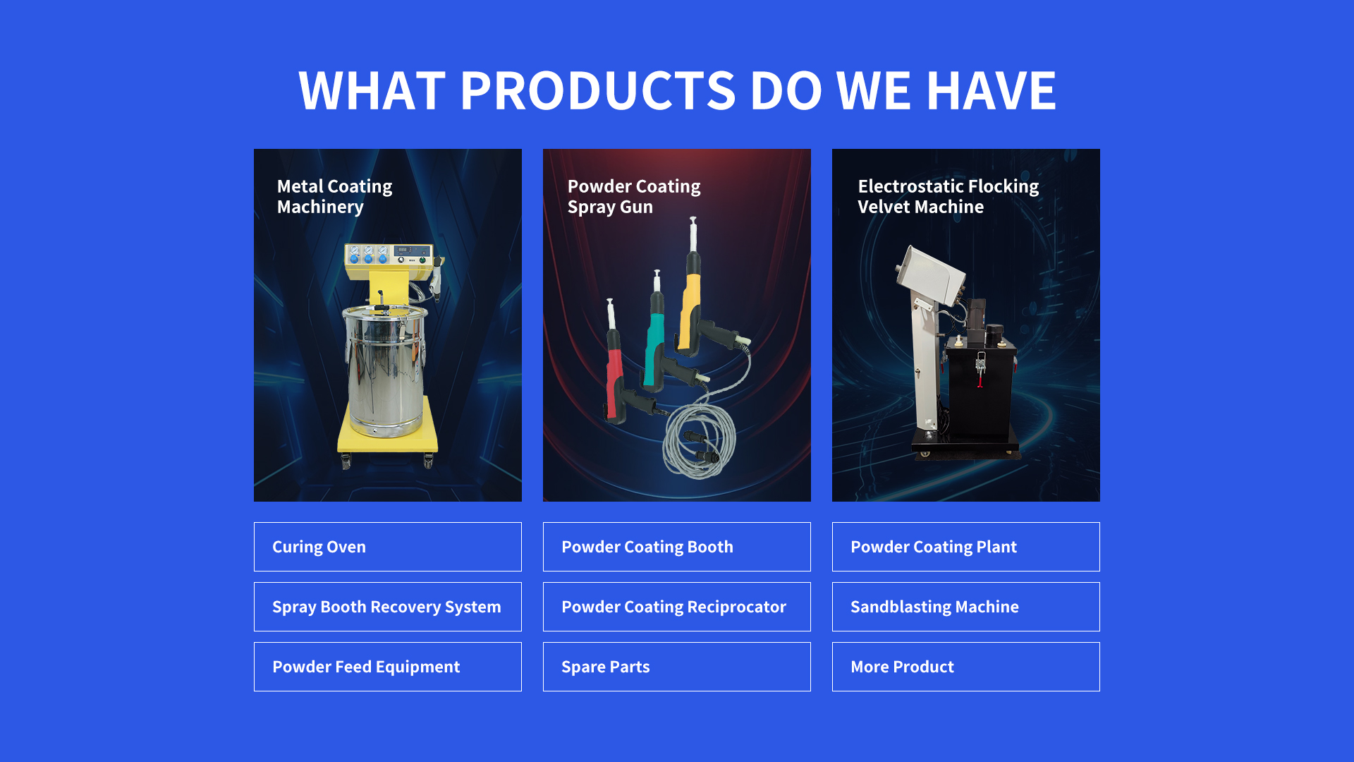 Powder Spraying Machine Company offers cutting-edge electrostatic coating systems designed for precision and durability. These machines consist of a spray gun, powder hopper, control panel, conveyor belt,